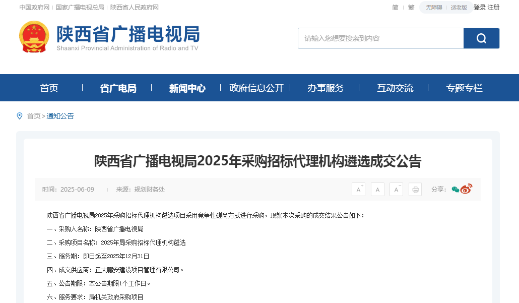 正大鵬安入圍陜西省廣播電視局2025年采購(gòu)招標(biāo)代理機(jī)構(gòu)