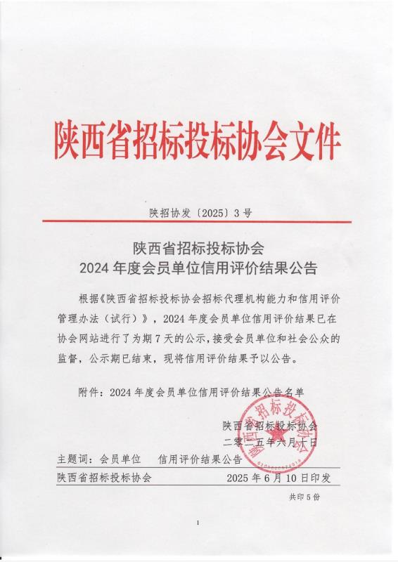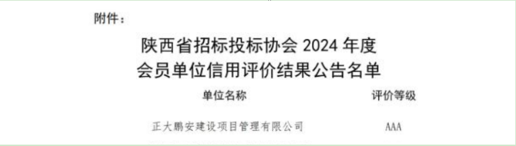 喜報(bào)!正大鵬安公司獲評(píng)陜西省招標(biāo)投標(biāo)協(xié)會(huì)2024年度信用評(píng)價(jià)最高等級(jí)—AAA級(jí)企業(yè)