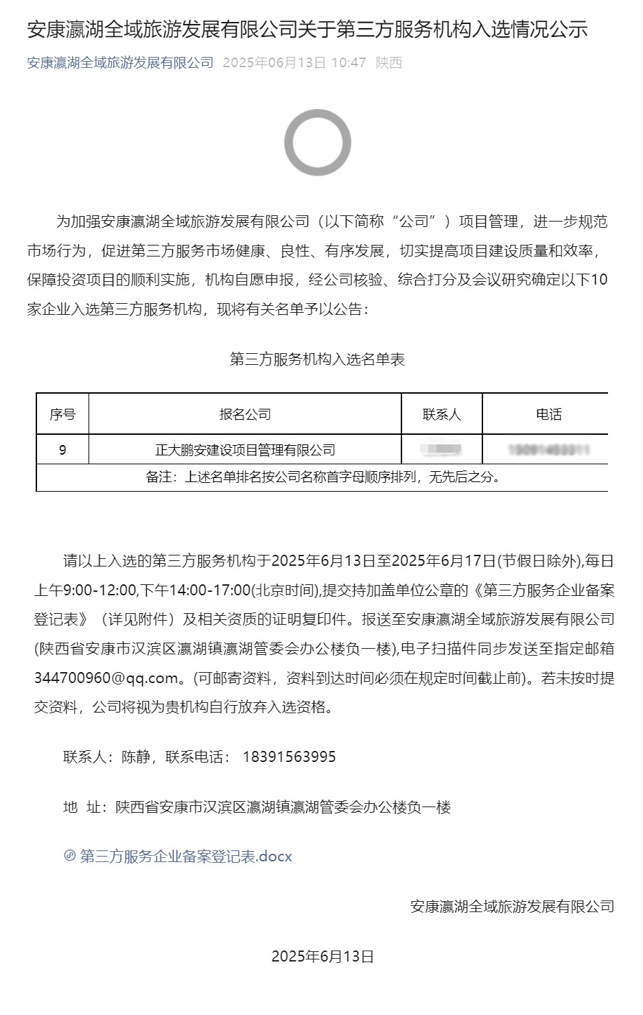 2025年6月13日,經(jīng)評(píng)標(biāo)委員會(huì)綜合評(píng)審,招標(biāo)人確認(rèn),正大鵬安建設(shè)項(xiàng)目管理有限公司入選安康瀛湖全域旅游發(fā)展有限公司第三方招標(biāo)造價(jià)服務(wù)機(jī)構(gòu)。