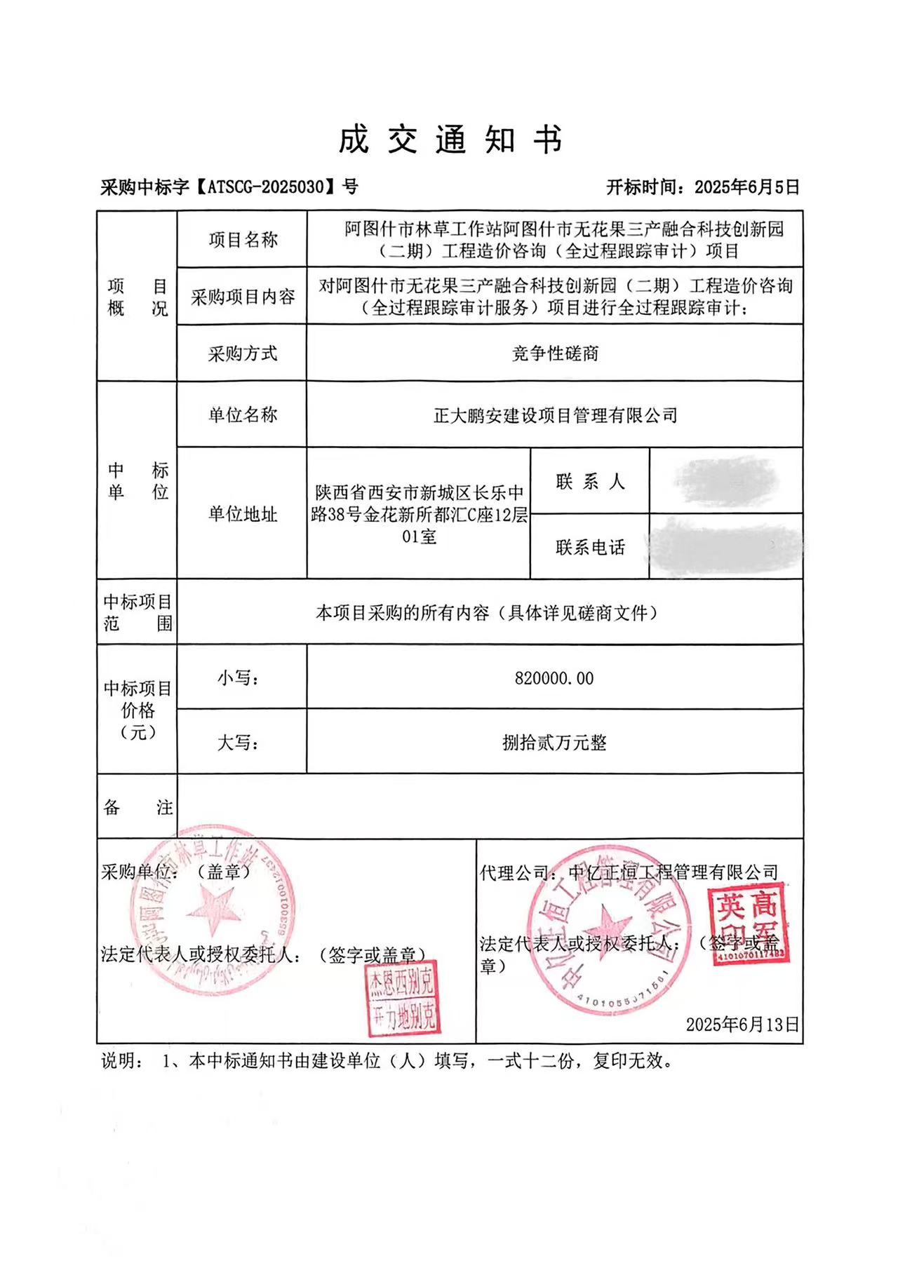 2025年6月5日,經(jīng)評標委員會綜合評審,招標人確認,正大鵬安建設(shè)項目管理有限公司中標阿圖什市無花果三產(chǎn)融合科技創(chuàng)新園(二期)工程造價咨詢(全過程跟蹤審計服務)項目。