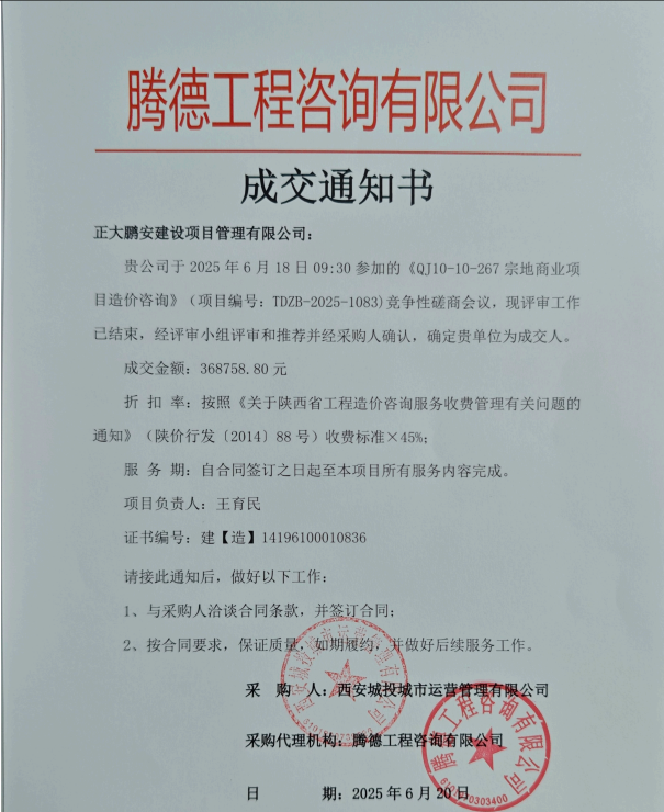 2025年6月19日,經(jīng)評(píng)標(biāo)委員會(huì)綜合評(píng)審,招標(biāo)人確認(rèn),正大鵬安建設(shè)項(xiàng)目管理有限公司中標(biāo)陜西省西安市QJ10-10-267宗地商業(yè)項(xiàng)目造價(jià)咨詢。