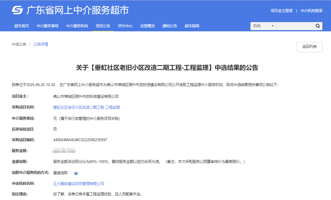 2025年6月25日,經(jīng)評標(biāo)委員會綜合評審,招標(biāo)人確認(rèn),正大鵬安中標(biāo)廣東省佛山市垂虹社區(qū)老舊小區(qū)改造二期工程監(jiān)理項目。