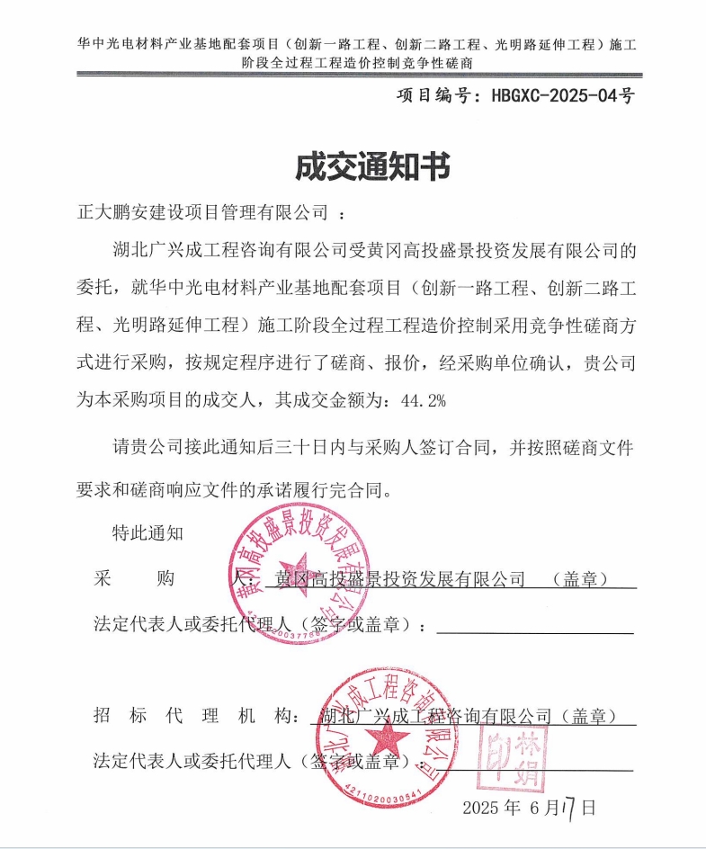 2025年6月17日,經(jīng)評(píng)標(biāo)委員會(huì)綜合評(píng)審,招標(biāo)人確認(rèn),正大鵬安建設(shè)項(xiàng)目管理有限公司中標(biāo)華中光電材料產(chǎn)業(yè)基地配套項(xiàng)目(創(chuàng)新一路工程、創(chuàng)新二路工程、光明路延伸工程)施工階段全過(guò)程工程造價(jià)控制。