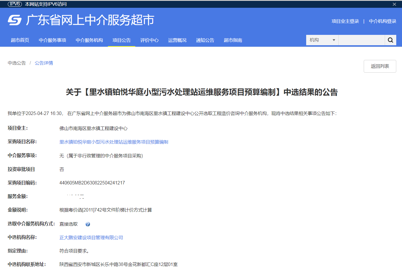 2025年4月27日,經(jīng)評標委員會綜合評審,招標人確認,正大鵬安建設項目管理有限公司中標里水鎮(zhèn)鉑悅?cè)A庭小型污水處理站運維服務項目預算編制。