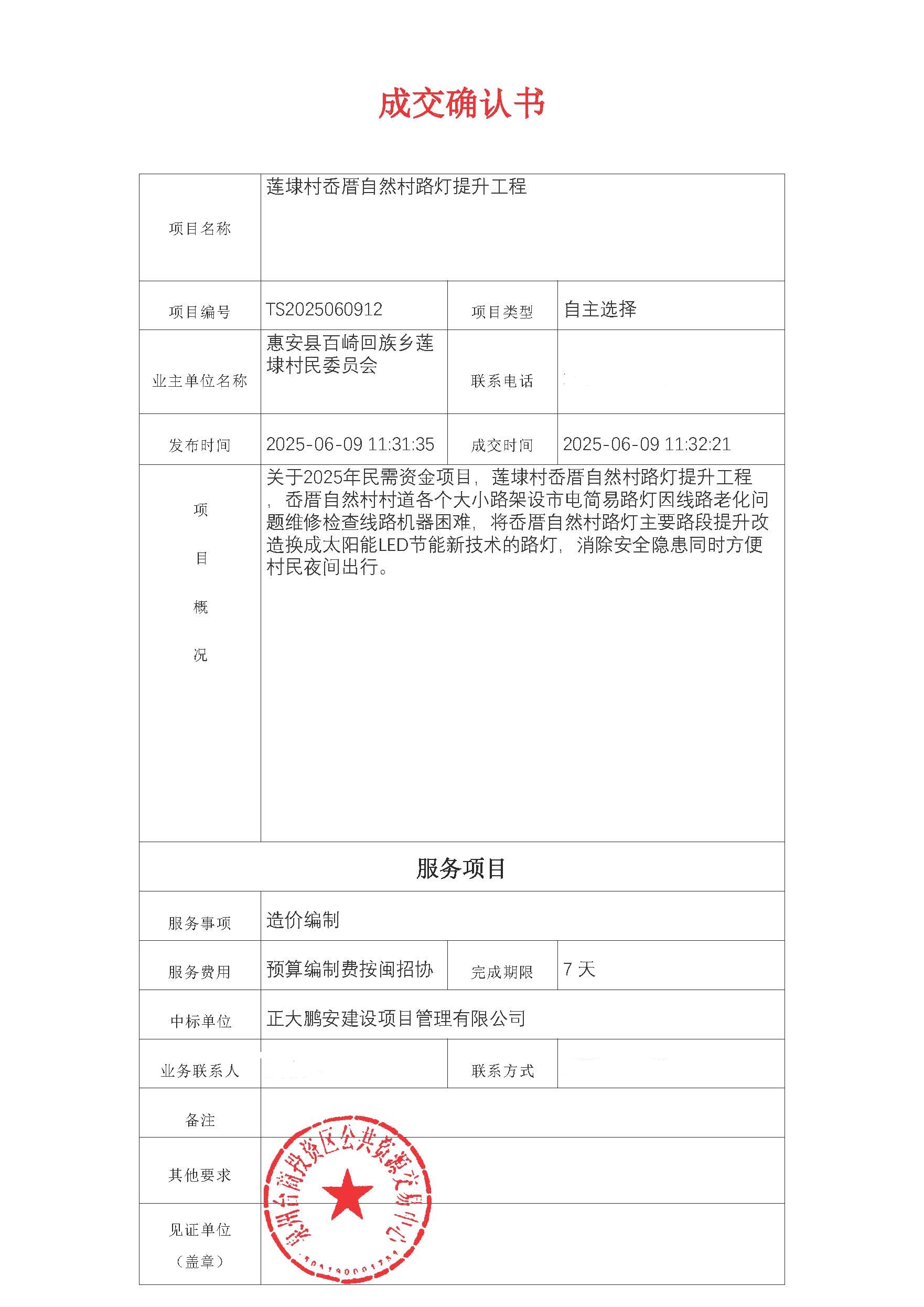 2025年6月9日,經(jīng)評標(biāo)委員會(huì)綜合評審,招標(biāo)人確認(rèn),正大鵬安建設(shè)項(xiàng)目管理有限公司中標(biāo)福建省泉州市惠安縣蓮埭村岙厝自然村路燈提升工程造價(jià)編制。
