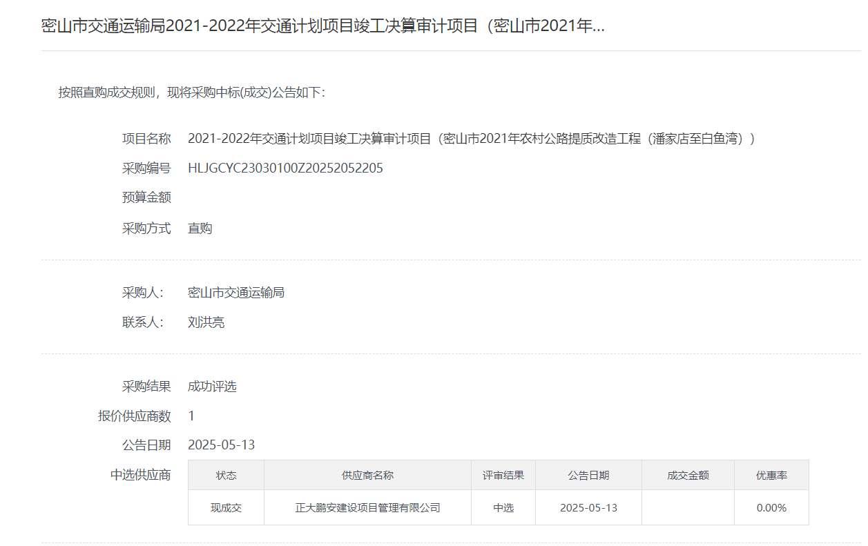2025年5月13日,經(jīng)評標(biāo)委員會(huì)綜合評審,招標(biāo)人確認(rèn),正大鵬安建設(shè)項(xiàng)目管理有限公司中標(biāo)2021-2022年交通計(jì)劃項(xiàng)目竣工決算審計(jì)項(xiàng)目(密山市2021年農(nóng)村公路提質(zhì)改造工程(潘家店至白魚灣)項(xiàng)目