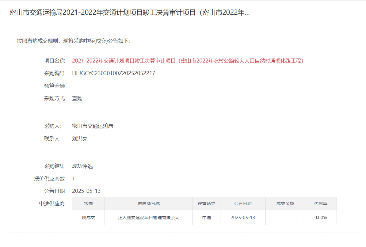 2025年5月13日,經(jīng)評(píng)標(biāo)委員會(huì)綜合評(píng)審,招標(biāo)人確認(rèn),正大鵬安建設(shè)項(xiàng)目管理有限公司中標(biāo)黑龍江省2021-2022年交通計(jì)劃項(xiàng)目竣工決算審計(jì)項(xiàng)目(密山市2022年農(nóng)村公路較大人口自然村通硬化路工程)。
