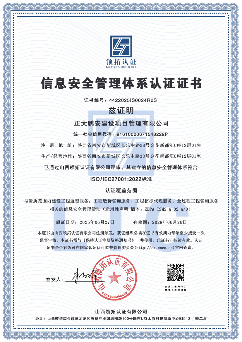 2025年6月30日,正大鵬安公司喜獲信息安全管理體系及知識(shí)產(chǎn)權(quán)合規(guī)管理體系雙認(rèn)證,標(biāo)志著公司在規(guī)范化管理和服務(wù)品質(zhì)提升方面取得重大突破。