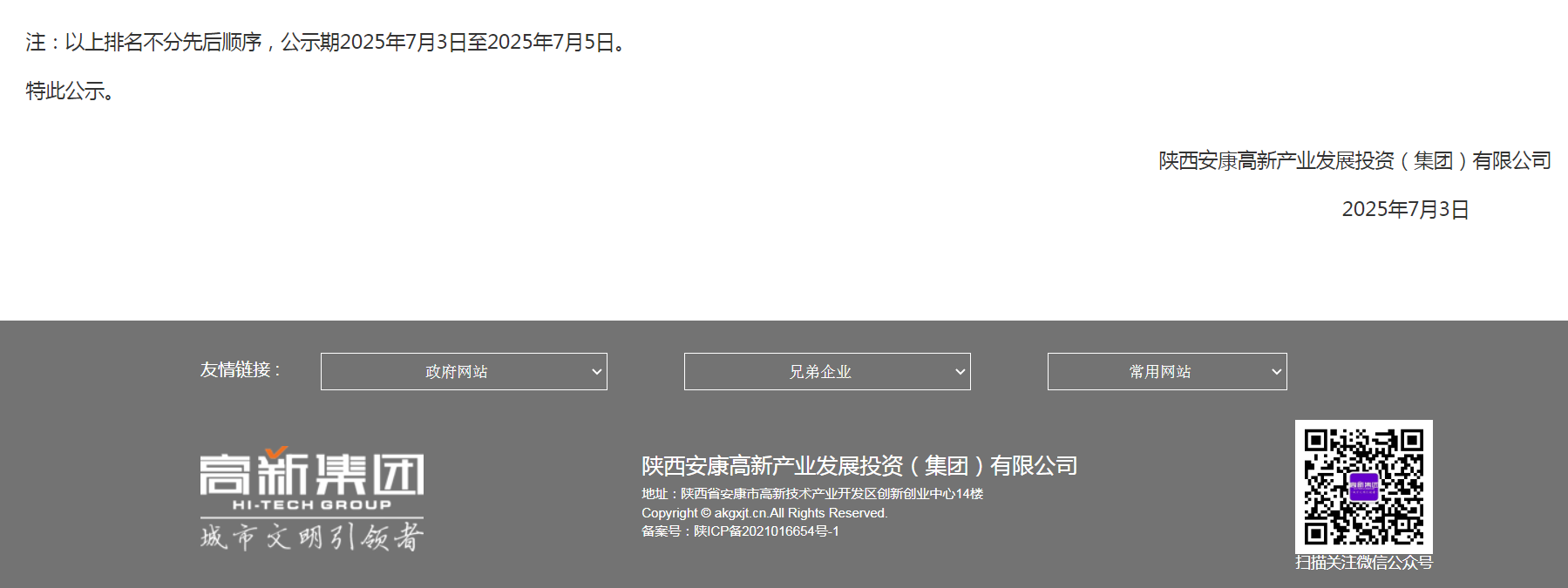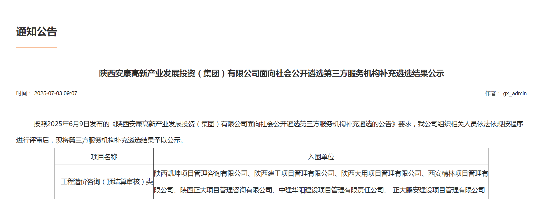2025年7月3日,經(jīng)評(píng)標(biāo)委員會(huì)綜合評(píng)審,招標(biāo)人確認(rèn),正大鵬安建設(shè)項(xiàng)目管理有限公司入圍陜西安康高新產(chǎn)業(yè)發(fā)展投資(集團(tuán))有限公司第三方服務(wù)機(jī)構(gòu)補(bǔ)充遴選工程造價(jià)咨詢(預(yù)結(jié)算審核)類項(xiàng)目。