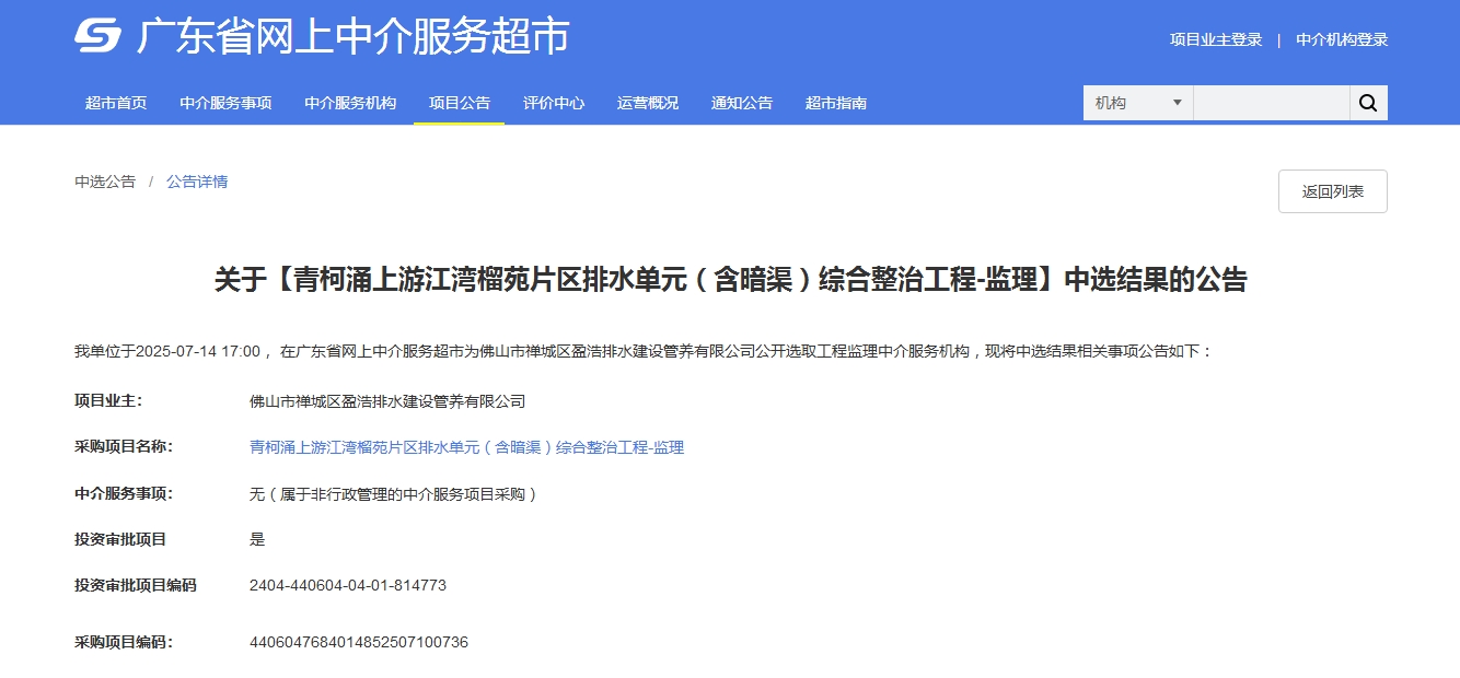 2025年7月14日,經(jīng)評(píng)標(biāo)委員會(huì)綜合評(píng)審,招標(biāo)人確認(rèn),正大鵬安中標(biāo)廣東市佛山市青柯涌上游江灣榴苑片區(qū)排水單元(含暗渠)綜合整治工程-監(jiān)理項(xiàng)目。