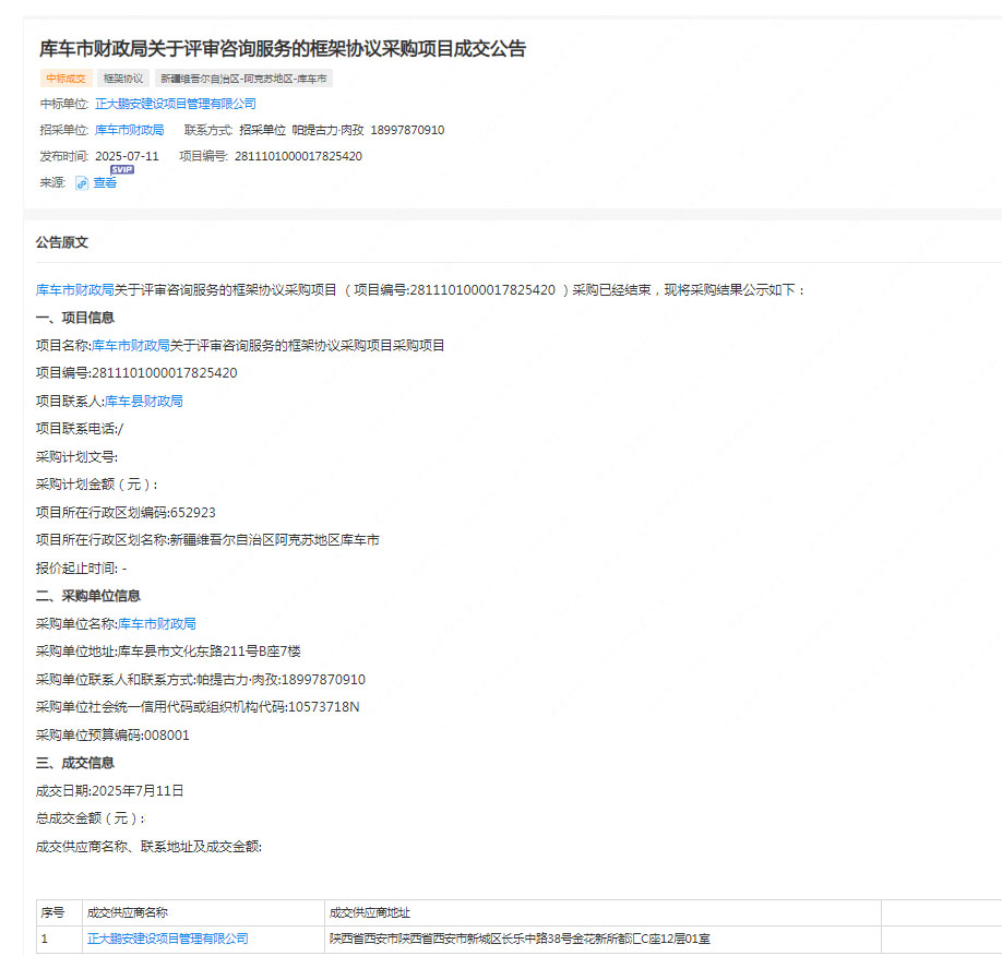 2025年7月11日,經(jīng)評標委員會綜合評審,招標人確認,正大鵬安建設項目管理有限公司中標新疆庫車市財政局關于評審咨詢服務的框架協(xié)議采購項目。
