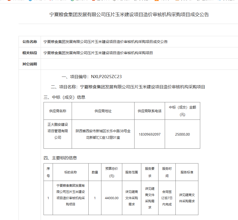 2025年7月18日,經(jīng)評標(biāo)委員會綜合評審,招標(biāo)人確認(rèn),正大鵬安建設(shè)項目管理有限公司中標(biāo)寧夏糧食集團發(fā)展有限公司壓片玉米建設(shè)項目造價審核機構(gòu)采購項目。