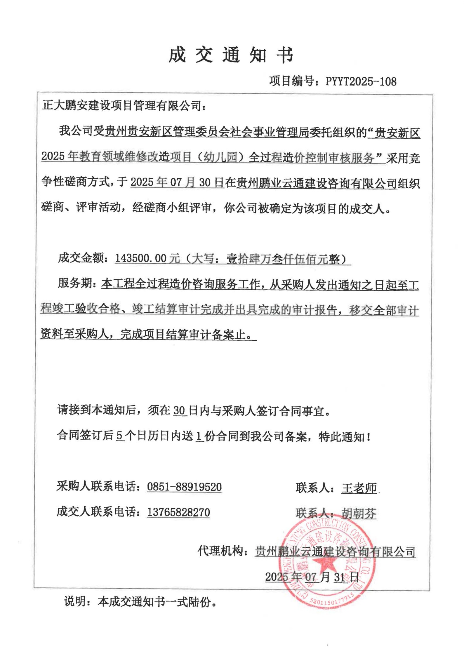 正大鵬安中標(biāo)貴州省貴安新區(qū)2025年教育領(lǐng)域維修改造項(xiàng)目(幼兒園)全過(guò)程造價(jià)控制審核服務(wù)