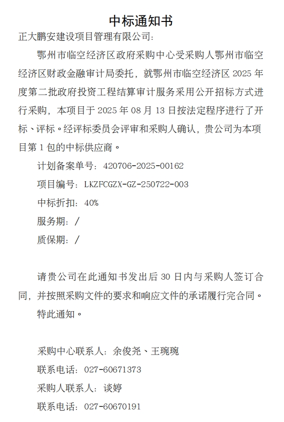 2025年8月13日,經(jīng)評(píng)標(biāo)委員會(huì)綜合評(píng)審,招標(biāo)人確認(rèn),正大鵬安建設(shè)項(xiàng)目管理有限公司中標(biāo)鄂州市臨空經(jīng)濟(jì)區(qū)2025年度第二批政府投資工程結(jié)算審計(jì)服務(wù)。