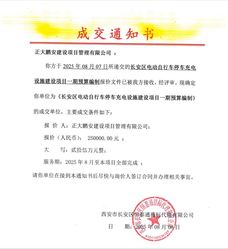 2025年8月7日,經(jīng)評標委員會綜合評審,招標人確認,正大鵬安中標長安區(qū)電動自行車停車充電設(shè)施建設(shè)項目一期預(yù)算編制。