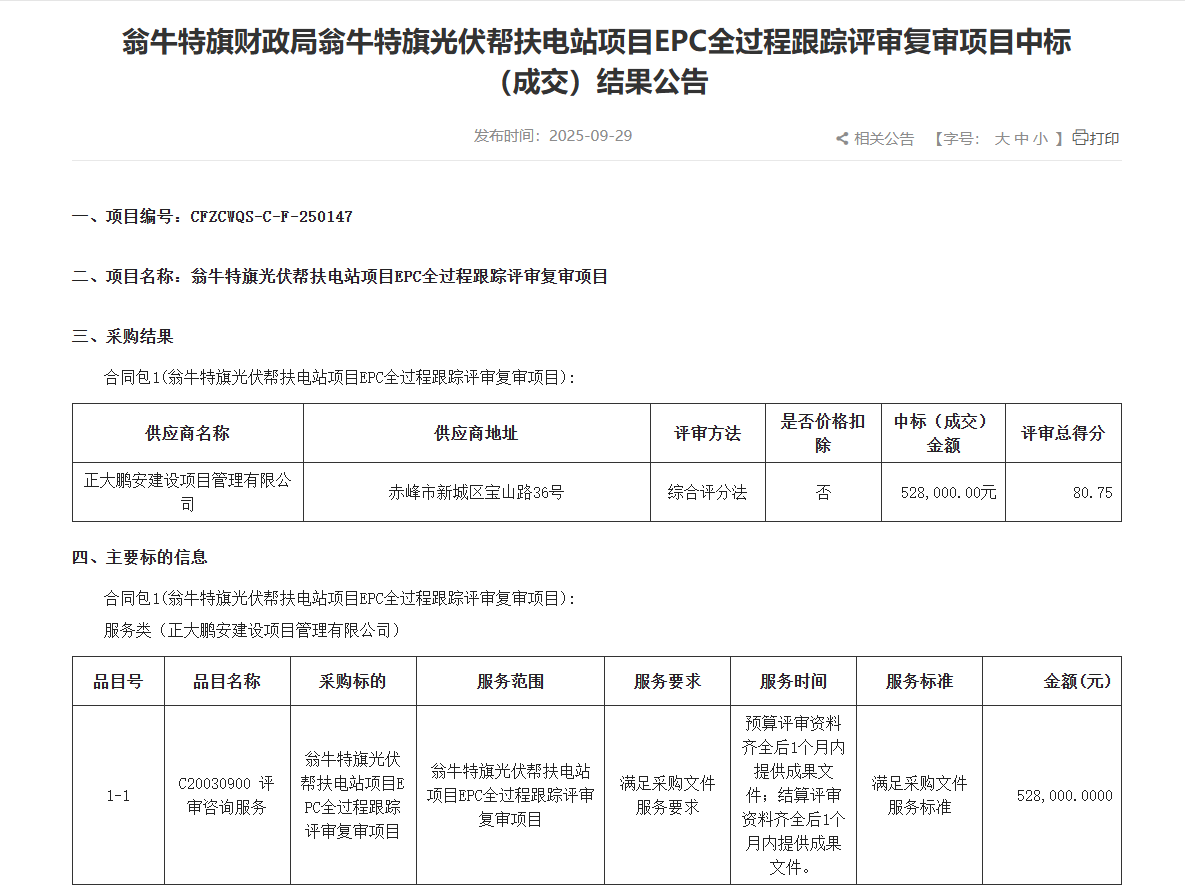 正大鵬安中標內(nèi)蒙古自治區(qū)赤峰市翁牛特旗財政局翁牛特旗光伏幫扶電站項目EPC全過程跟蹤評審復審項目