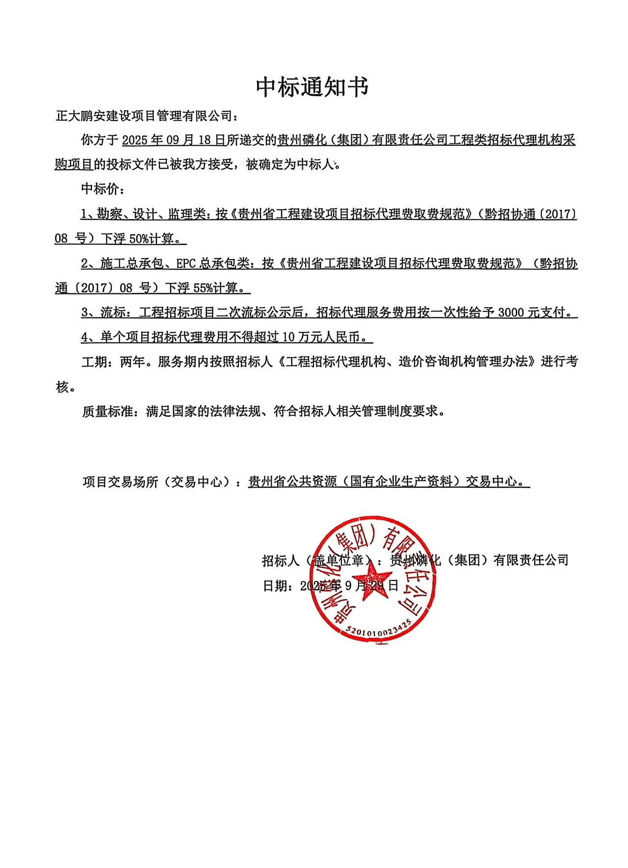 2025年9月29日,經(jīng)評(píng)標(biāo)委員會(huì)綜合評(píng)審,招標(biāo)人確認(rèn),正大鵬安中標(biāo)貴州磷化(集團(tuán))有限責(zé)任公司工程類招標(biāo)代理機(jī)構(gòu)采購(gòu)項(xiàng)目。