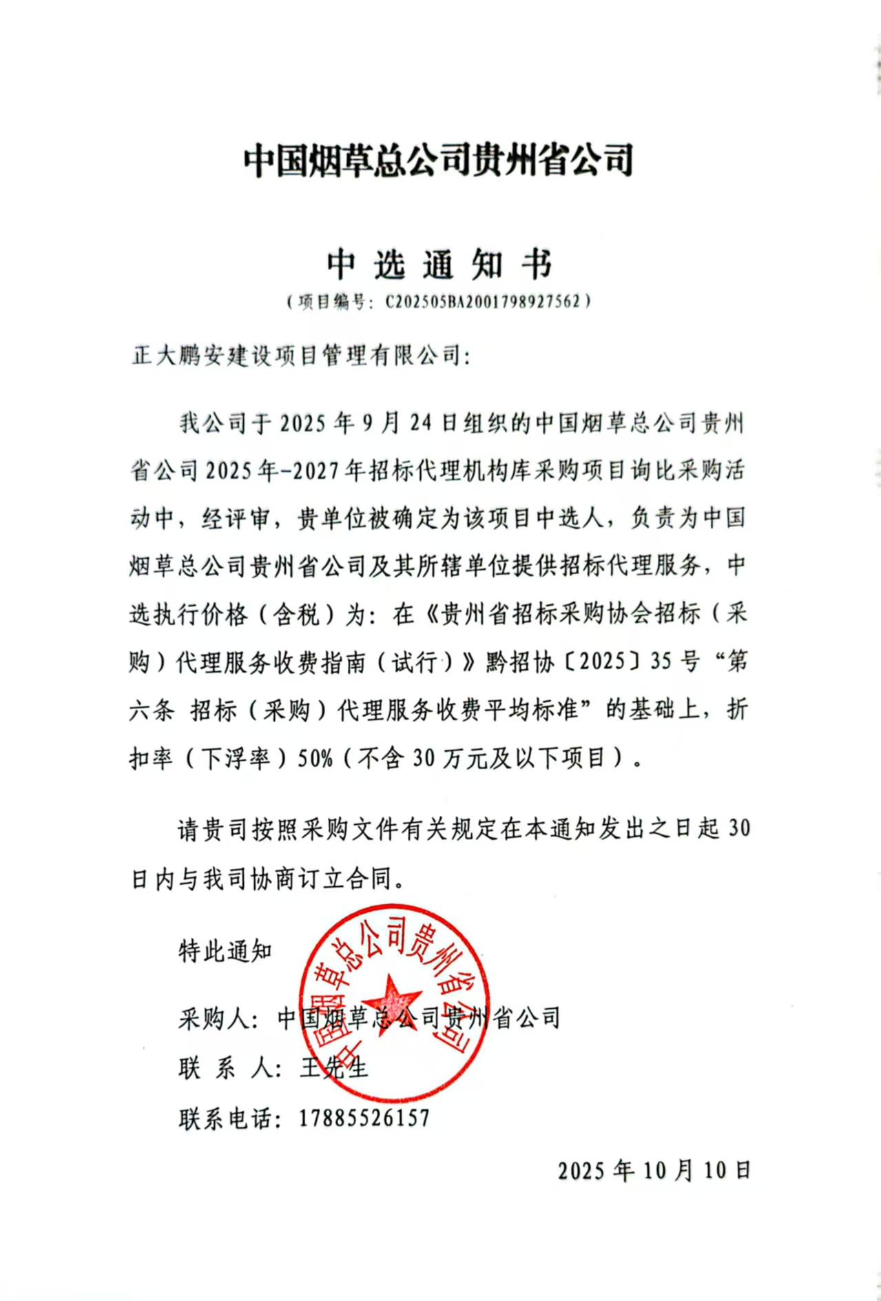 2025年10月10日,經(jīng)評標(biāo)委員會綜合評審,招標(biāo)人確認(rèn),正大鵬安中標(biāo)中國煙草總公司貴州省公司2025年-2027年招標(biāo)代理機(jī)構(gòu)庫采購項目。